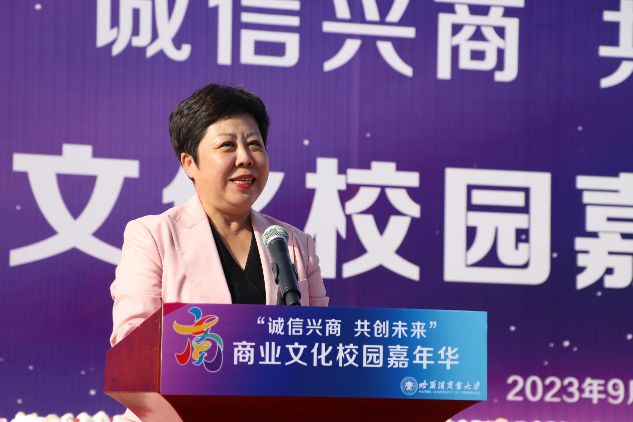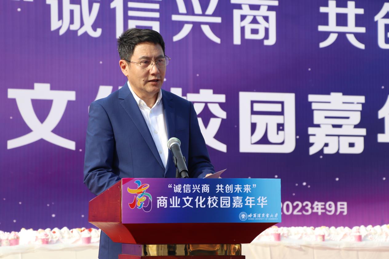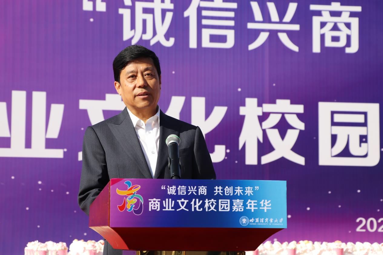 哈爾濱商業(yè)大學(xué)黨委書記孫先民致辭。他表示,誠(chéng)信“軟實(shí)力”為高質(zhì)量發(fā)展提供“硬支撐”。本屆“誠(chéng)信興商·共創(chuàng)未來(lái)”商業(yè)文化校園嘉年華活動(dòng)堅(jiān)持以文化力量啟智潤(rùn)心、固本培元,是深入學(xué)習(xí)貫徹習(xí)近平總書記在主持召開(kāi)新時(shí)代推動(dòng)?xùn)|北全面振興座談會(huì)和視察我省時(shí)的重要講話重要指示精神,全面落實(shí)立德樹(shù)人根本任務(wù)的務(wù)實(shí)舉措。哈爾濱商業(yè)大學(xué)作為新中國(guó)第一所多科性商業(yè)大學(xué),始終堅(jiān)持“大商鑄才、大雅育人、商雅兼?zhèn)?、?jīng)世濟(jì)民”的育人理念,厚植師生“心懷祖國(guó),至誠(chéng)奉獻(xiàn),以商弘業(yè),矢志一流”的大商之道?;顒?dòng)將充分發(fā)揮老字號(hào)在文化引領(lǐng)、品牌建設(shè)、產(chǎn)業(yè)升級(jí)等方面的示范引領(lǐng)作用,彰顯龍江市場(chǎng)主體活力與創(chuàng)新力,聚焦建設(shè)“六個(gè)龍江”、推進(jìn)“八個(gè)振興”,筑牢堅(jiān)定龍江文化繁榮發(fā)展的自信根基,進(jìn)一步凝聚師生扎根龍江、服務(wù)龍江、建設(shè)龍江的情懷和力量。