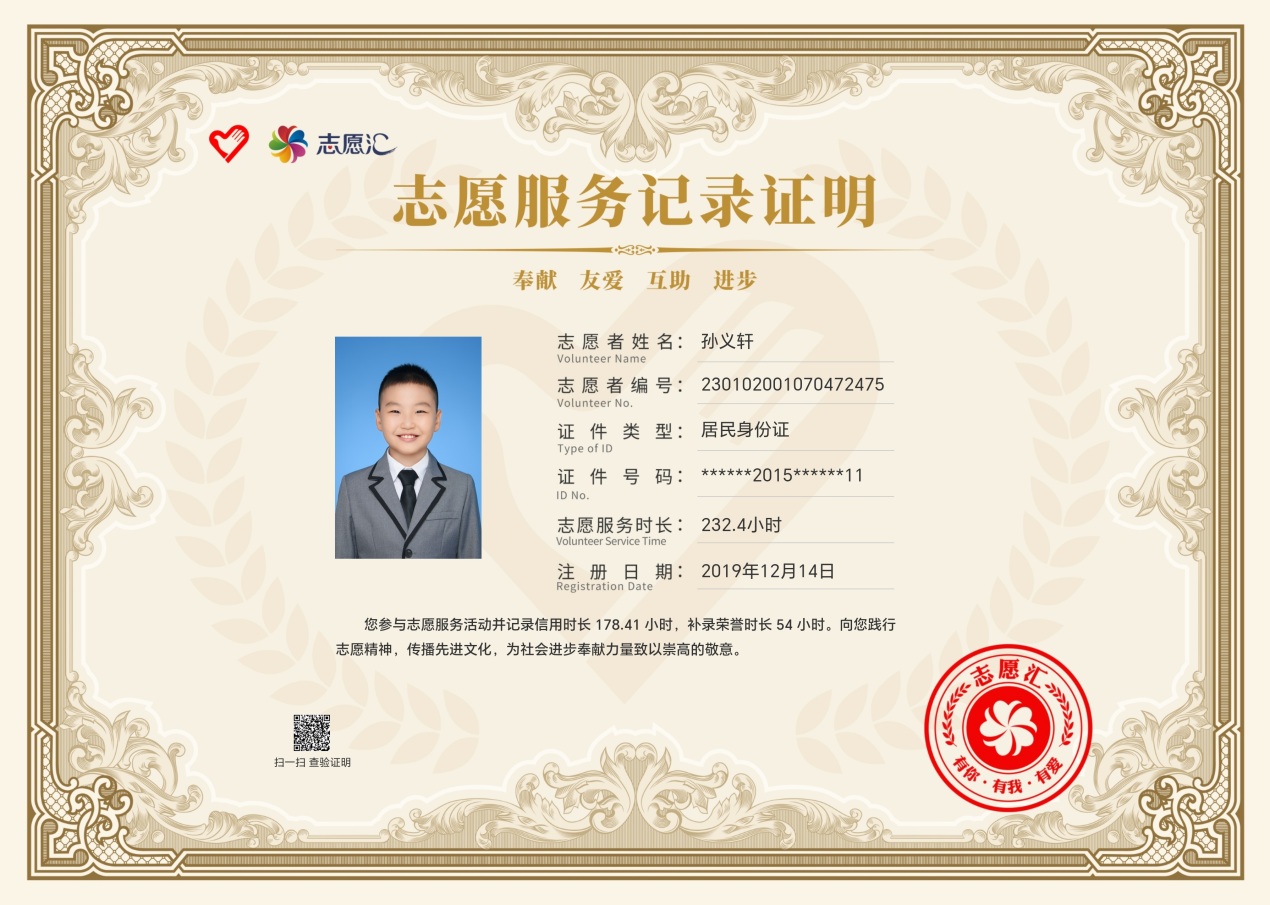 上學后的孫義軒同學更是把助人為樂當作自己日常的志愿行動。他一邊認真學習文化課程,一邊通過積極參加志愿活動提升自己。