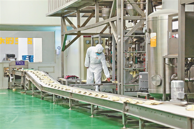 農(nóng)墾龍王食品公司車間的生產(chǎn)線正開足馬力運(yùn)轉(zhuǎn)。本報(bào)記者 張翎攝