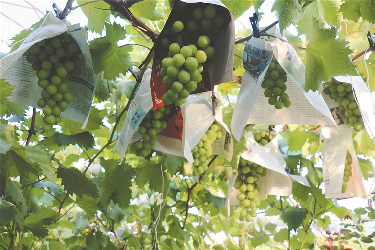 “我種的這個(gè)葡萄品種叫夏黑,外形像乒乓球,口感清脆,較甜,施用農(nóng)家肥做底料,成熟早又耐運(yùn)輸,收購(gòu)商特別喜歡。一畝地產(chǎn)葡萄2000斤以上,除去成本,一個(gè)大棚純收入3萬(wàn)元以上,收入十分可觀?!狈N植戶曹偉勝欣喜地說(shuō)。