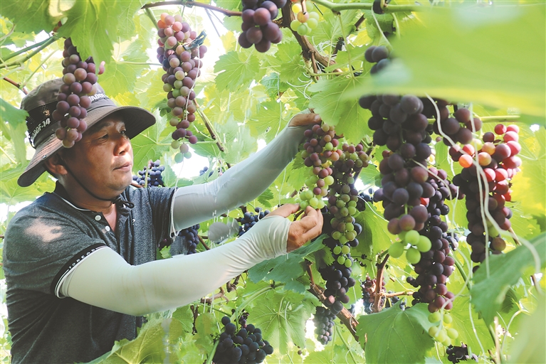 “春棚栽培的葡萄在8月中旬成熟,而在暖棚里,由于溫度、濕度得到科學(xué)精準(zhǔn)控制,葡萄成熟得更早,產(chǎn)量更高。7月10日左右即可上市,搶占市場(chǎng)空缺?!笔卟斯矩?fù)責(zé)人王軍強(qiáng)邊說(shuō)一邊拿起手機(jī)拍攝,為一周后葡萄上市進(jìn)行宣傳。