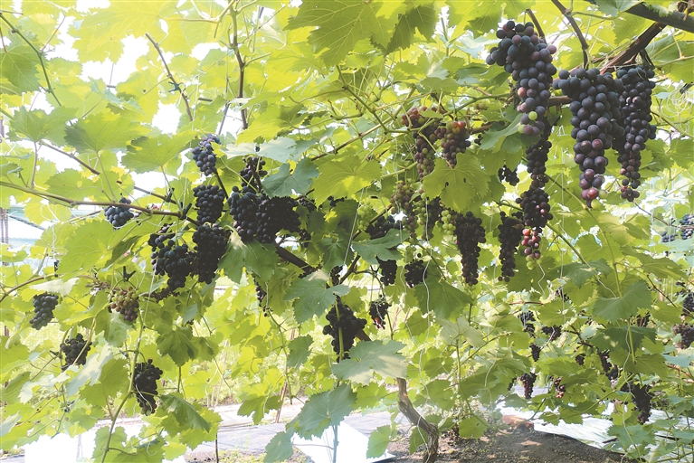 “‘陽(yáng)光玫瑰’是近幾年引進(jìn)的新品種,因其果肉多、甜度高、口感佳,受到不少市民的喜歡,每年都有不少商家、居民前來(lái)采購(gòu)。目前,‘夏黑’已處于成熟期,‘陽(yáng)光玫瑰’預(yù)計(jì)9月中下旬成熟?!辈軅俳榻B。