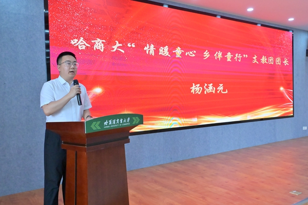 省希望工程捐助中心主任、省青少年發(fā)展基金會(huì)理事長(zhǎng)杜晶為哈爾濱商業(yè)大學(xué)2024年“三下鄉(xiāng)”社會(huì)實(shí)踐團(tuán)隊(duì)代表、“情暖童心·鄉(xiāng)伴童行”支教團(tuán)代表授旗,希望即將奔赴龍江大地的志愿者們能夠充分利用服務(wù)期,向下扎根、向上生長(zhǎng),踐行志愿服務(wù)精神,在奉獻(xiàn)與收獲中積累報(bào)國(guó)為民的樸素情懷,做有理想、有擔(dān)當(dāng)?shù)男聲r(shí)代青年。