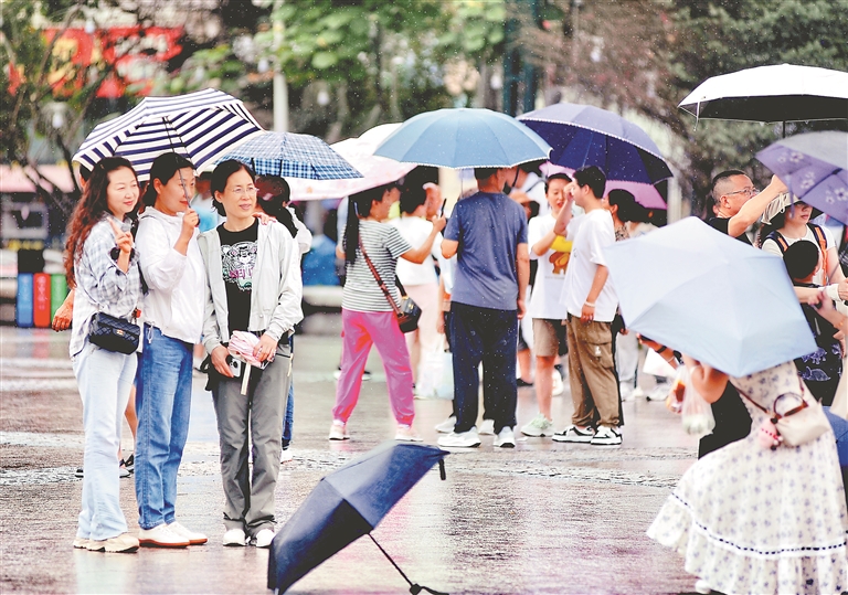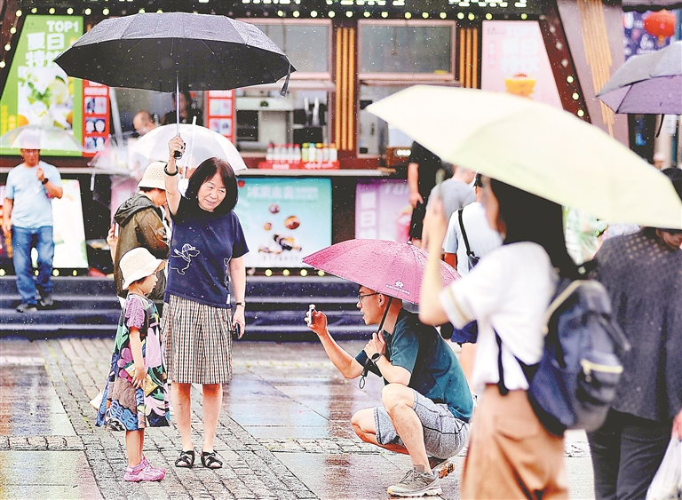 23日,哈爾濱市出現(xiàn)陣雨天氣。在索菲亞教堂、中央大街、江畔等地,游客們一邊觀賞美麗風(fēng)景,一邊享受夏日清涼。