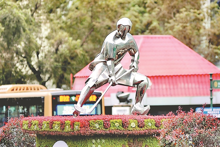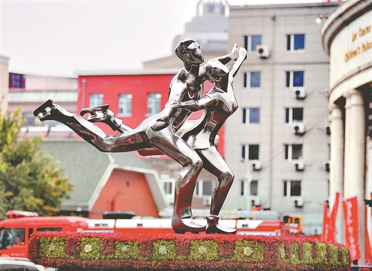 9日,在哈爾濱市南崗區(qū)紅軍街上,一處綠地里以亞冬會(huì)冰雪比賽項(xiàng)目為主題的雕塑群吸引了行人的目光。這些雕塑外觀銀色、制作精美、栩栩如生,展現(xiàn)了運(yùn)動(dòng)員奮力拼搏、勇往直前的精神風(fēng)貌。