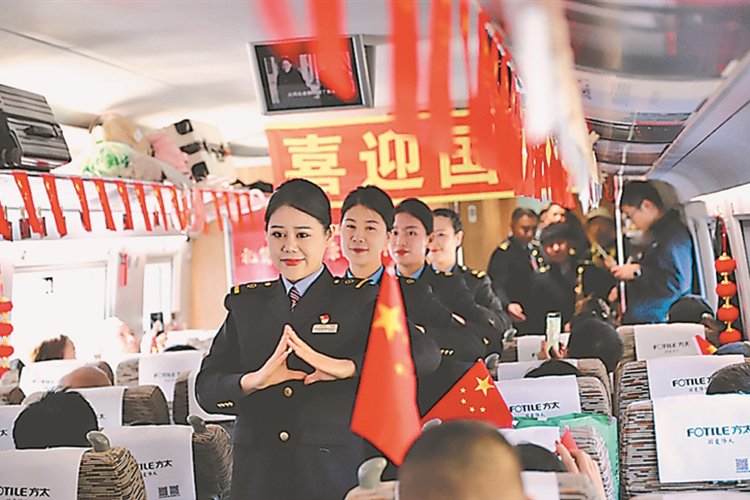 G774次列車(chē)乘務(wù)人員與乘客一起聯(lián)歡。本報(bào)記者 王迪攝