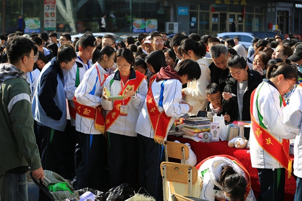 在現(xiàn)場(chǎng),圖書(shū)、文具、玩具、小飾品、手工畫(huà)、筆筒、相冊(cè)、陶瓷杯、鬧鐘、字帖、明信片、橡皮等各色賣品整齊有序地出現(xiàn)在了桌子上,琳瑯滿目,形成一道亮麗的風(fēng)景線。負(fù)責(zé)售賣的同學(xué)們臉上洋溢著熱情明媚的笑容,從容不迫、落落大方地向客人們介紹著賣品。志愿者服務(wù)隊(duì)的同學(xué)們也被大會(huì)現(xiàn)場(chǎng)的氣氛所感染,不斷地將顧客吸引到現(xiàn)場(chǎng)。一時(shí)間。人群熙熙攘攘,前來(lái)詢問(wèn)的顧客人山人海,絡(luò)繹不絕。