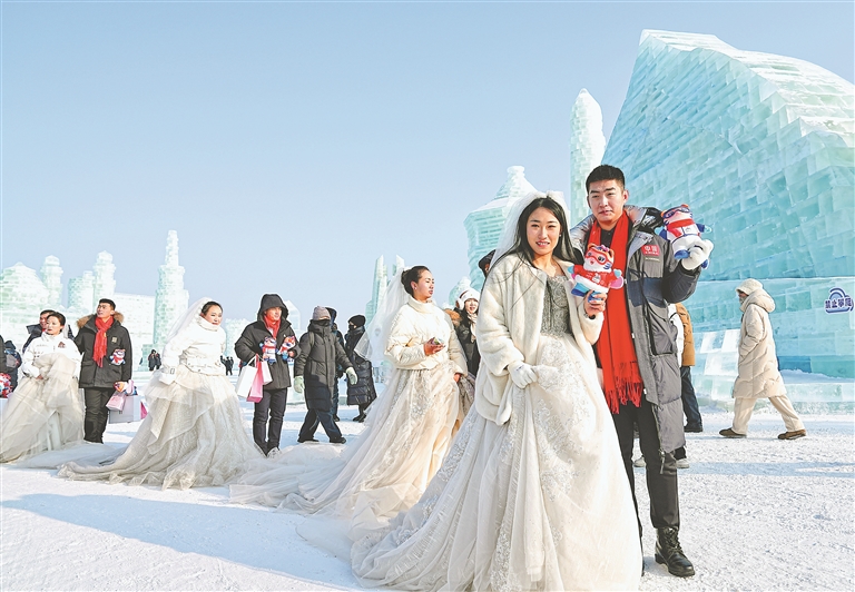 哈爾濱公益冰雪集體婚禮至今已成功舉辦41屆,共有來自全球五大洲20多個國家的1320對新婚和紀念婚夫婦,到哈爾濱體驗冰雪激情、觀賞冰雪奇觀,在象征忠貞的冰雪世界開啟幸福的婚姻旅程。