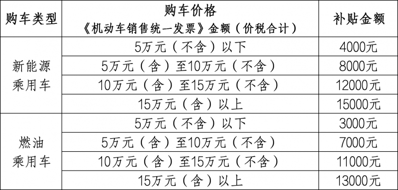 細則規(guī)定,消費者轉(zhuǎn)讓的舊車應(yīng)于2025年1月8日前登記在申請人名下。在購買新車時,按照《機動車銷售統(tǒng)一發(fā)票》金額(價稅合計),置換車輛為新能源乘用車新車的:5萬元(不含)以下每輛補貼4000元;5(含)-10萬元(不含)補貼8000元;10(含)-15萬元(不含)補貼12000元;15萬元(含)以上補貼15000元。如置換燃油乘用車:5萬元(不含)以下補貼3000元;5(含)-10萬元(不含)補貼7000元;10(含)-15萬元(不含)補貼 11000元;15萬元(含)以上補貼13000元。補貼資金用完活動即止。