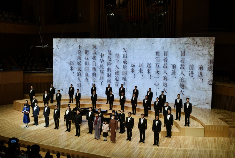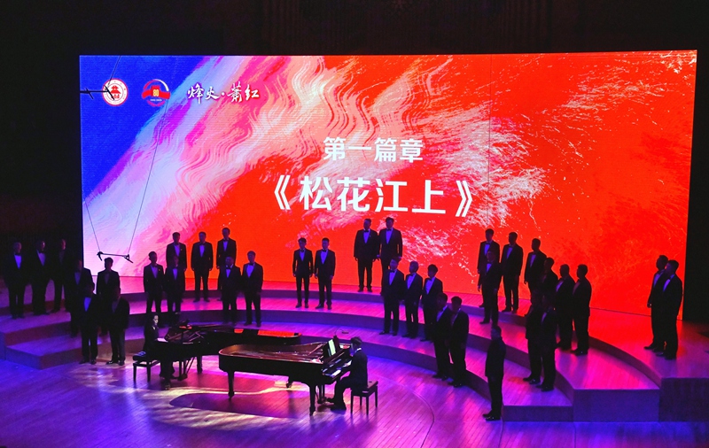 第一篇章《松花江上》以《長城謠》的泣血鄉(xiāng)愁與《義勇軍進(jìn)行曲》的全場肅立高唱,訴盡抗戰(zhàn)時(shí)期的流亡之痛與民族豪情,更創(chuàng)新植入“童年、少女、青年”三代“蕭紅”扮演者(張舒涵、鄭楚琪、尤泓斐)與合唱團(tuán)的情景互動(dòng)。第二篇章《抗戰(zhàn)的烽火》中,《五月的鮮花》《露營之歌》《保衛(wèi)黃河》等作品以合唱與立體站位,緬懷趙一曼、楊靖宇等英烈,再現(xiàn)全民抗戰(zhàn)的壯闊圖景。第三篇章《文脈永續(xù)》則通過魯迅、茅盾等文學(xué)名家對(duì)蕭紅的評(píng)價(jià)、跨年代讀者代表致敬及《致祖國》的磅礴合唱,彰顯其文學(xué)精神在新時(shí)代的傳承。