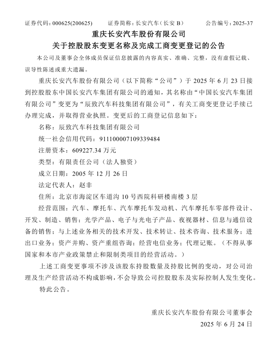 6月23日晚間,重慶長安汽車股份有限公司(以下簡稱“長安汽車”;000625)發(fā)布公告稱,公司接到控股股東中國長安汽車集團有限公司通知,其名稱由“中國長安汽車集團有限公司”變更為“辰致汽車科技集團有限公司”,并已完成工商變更登記手續(xù)。