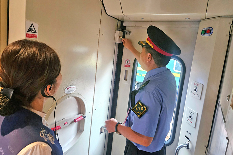 列車長在對車門加鎖情況進(jìn)行檢查。(韓峰 攝)