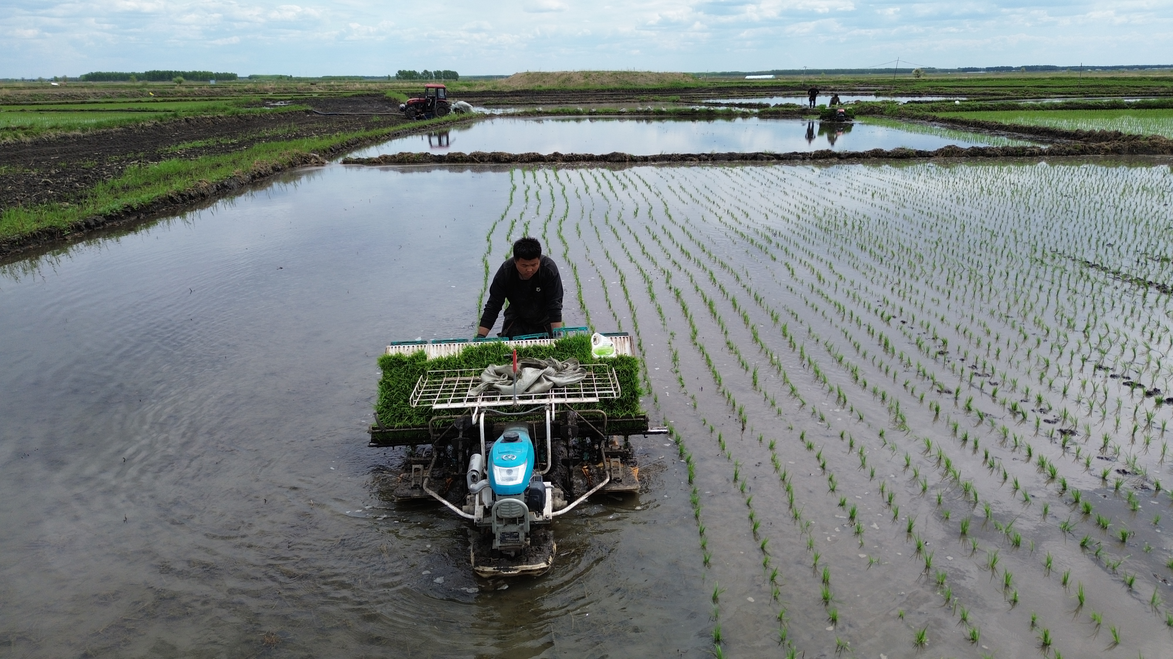 在光榮鄉(xiāng)1.4萬畝稻田區(qū),機(jī)械化作業(yè)與智能設(shè)配的配合成為春耕焦點(diǎn)。在水田作業(yè)現(xiàn)場,插秧機(jī)勻速行進(jìn),秧苗以均勻的間距和深度整齊入泥;無人機(jī)則沿規(guī)劃航線精準(zhǔn)運(yùn)送秧苗箱,實(shí)現(xiàn)了從“人工運(yùn)秧”到“空中補(bǔ)給”的升級(jí)。機(jī)械化作業(yè)確保了株距、深度的標(biāo)準(zhǔn)化,為秧苗的扎根生長奠定基礎(chǔ)。放眼望去,成行的秧苗如綠色線條在田野鋪展,很是壯觀。