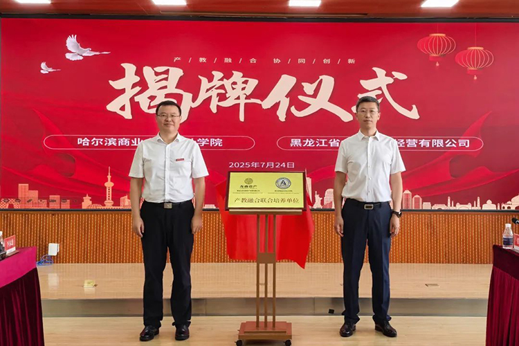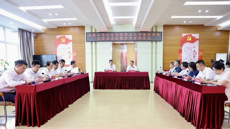 活動中,王彬、趙大偉共同為“產教融合聯(lián)合培養(yǎng)單位”揭牌。龍睿公司黨委委員、總會計師劉躍剛,哈爾濱商業(yè)大學會計學院院長梁運吉代表雙方簽署了《戰(zhàn)略合作協(xié)議》及《財務人員兩年培養(yǎng)工程計劃合作協(xié)議》。