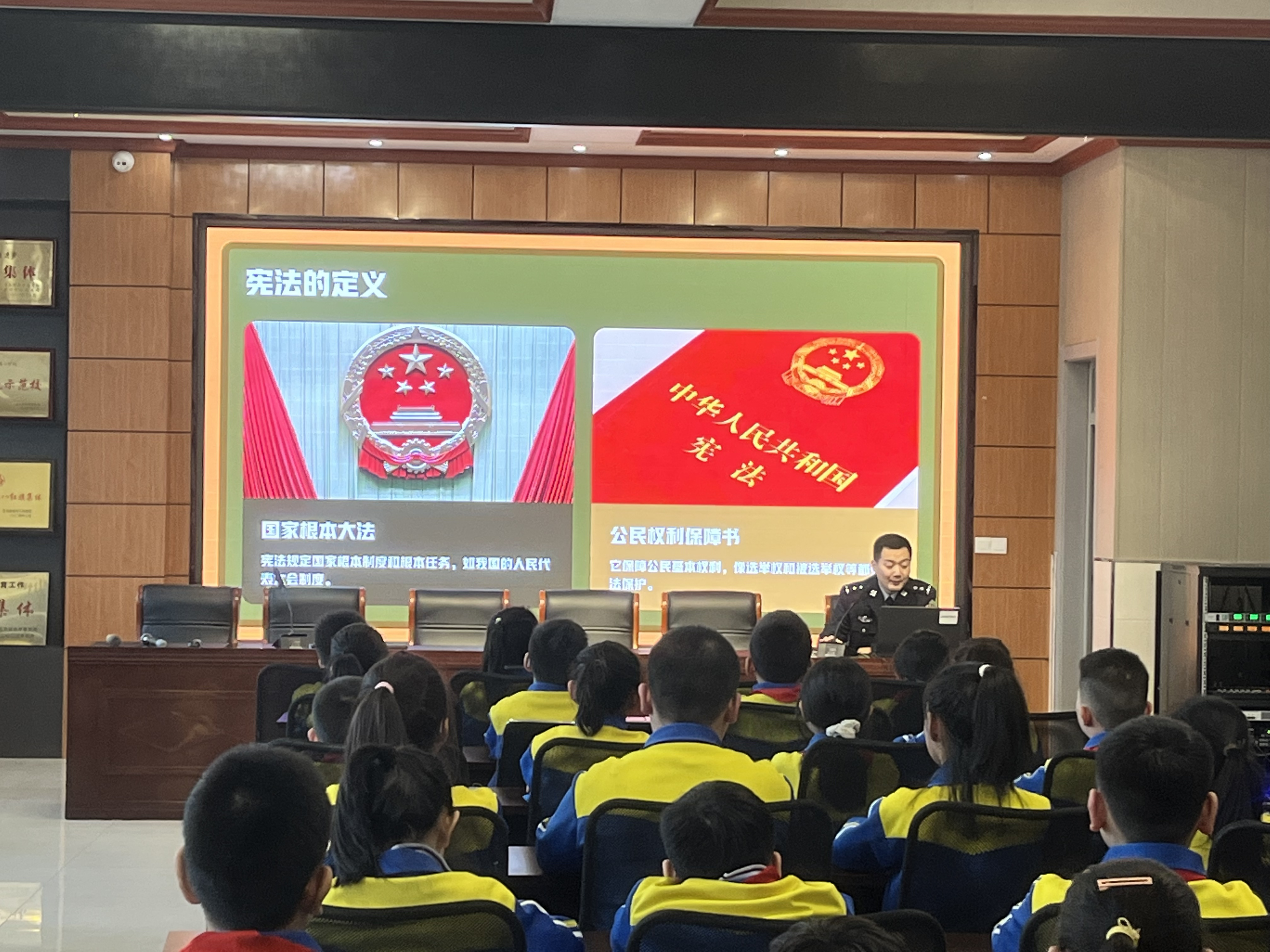 講座中,民警以通俗生動的語言,圍繞三大核心內(nèi)容展開宣講:一是憲法基礎(chǔ)認知,重點闡釋憲法作為國家根本大法的地位與作用,結(jié)合受教育權(quán)、人身安全保障、遵守校園規(guī)則等小學(xué)生熟悉的生活場景,讓學(xué)生真切感受到憲法并非“遙遠的法律”,而是與自身息息相關(guān)的行為準則;二是權(quán)利與義務(wù)對應(yīng),明確小學(xué)生依法享有的受教育權(quán)、人格尊嚴不受侵犯等合法權(quán)利,同時詳細講解遵守憲法法律、尊敬師長、維護公共秩序等必須履行的義務(wù),引導(dǎo)學(xué)生樹立“權(quán)利有邊界,義務(wù)須履行”的法治觀念;三是校園法治安全,針對校園欺凌、交通安全、網(wǎng)絡(luò)安全、防范陌生人侵害等問題,民警結(jié)合憲法及相關(guān)法律對未成年人的保護規(guī)定,傳授簡單實用的自我保護方法和求助途徑,著重強調(diào)遇到危險時可及時撥打110報警電話或告知老師、家長。