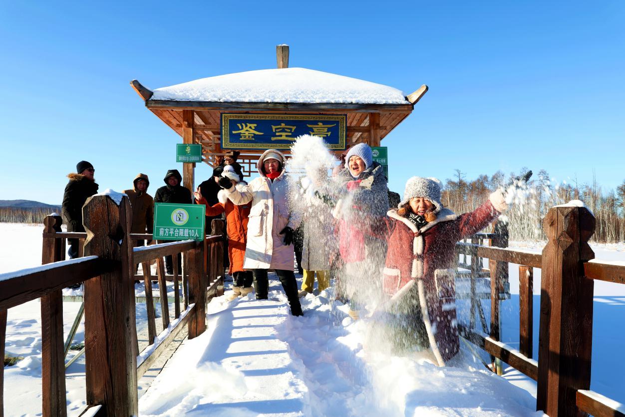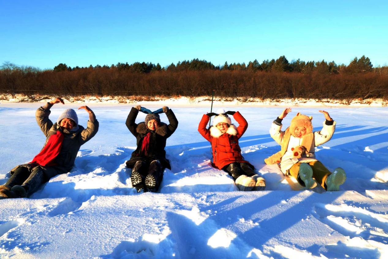 黑龍江省詩詞協(xié)會采風團成員在雙妃湖親身感受冰雪文化和驛站文化(王力 攝)