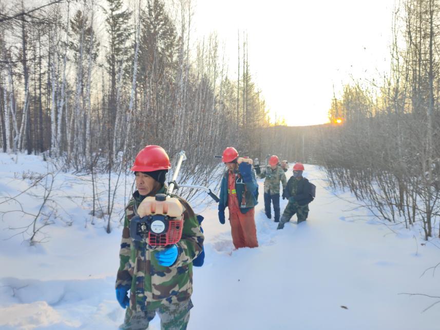 規(guī)范操作不松懈,筑牢安全“防護(hù)墻”。在各營林作業(yè)現(xiàn)場,寒風(fēng)凜冽卻擋不住職工們的工作熱情。大家嚴(yán)格遵守冬季營林作業(yè)規(guī)程,統(tǒng)一佩戴安全帽穿梭在林間,有條不紊地開展林木修枝、病腐木清理、林地?fù)嵊裙ぷ?。油鋸手?yán)格執(zhí)行“先檢查、再啟動(dòng)、穩(wěn)操作”的流程,精準(zhǔn)把控作業(yè)角度;撫育隊(duì)員踩著厚雪,手持工具對林間枯死木、被壓木及對目的樹種生長存在影響的進(jìn)行有序清理、歸堆。從器械檢查到流程落實(shí),每一個(gè)環(huán)節(jié)都嚴(yán)謹(jǐn)規(guī)范,安全帽上的反光條在皚皚白雪中格外醒目,成為林海間一道守護(hù)安全的風(fēng)景線。