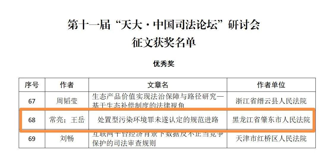 黑龍江經(jīng)濟(jì)網(wǎng)訊(董慧瑩 李雪松)近日,由中國(guó)行為法學(xué)會(huì)司法專業(yè)委員會(huì)主辦、天津大學(xué)承辦的第十一屆“天大·中國(guó)司法論壇”研討會(huì)征文獲獎(jiǎng)名單公布。本次征文活動(dòng)共收到投稿論文620篇,經(jīng)評(píng)委會(huì)嚴(yán)格評(píng)審,共選出一等獎(jiǎng)8個(gè)、二等獎(jiǎng)24個(gè)、三等獎(jiǎng)48個(gè)、優(yōu)秀獎(jiǎng)102個(gè)。其中,肇東市人民法院審管辦副主任常亮、審管辦書記員王岳撰寫的學(xué)術(shù)論文《處置型污染環(huán)境罪未遂認(rèn)定的規(guī)范進(jìn)路》榮獲優(yōu)秀獎(jiǎng)。