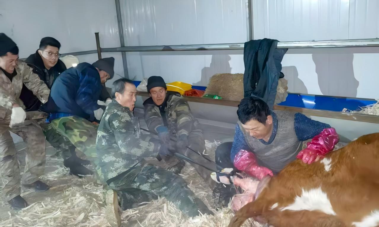 趕到牛棚時(shí),發(fā)現(xiàn)一頭棕白花母牛臥在干草堆上,四肢抽搐,腹部劇烈起伏卻始終無法完成生產(chǎn)。 “別急,我們現(xiàn)在應(yīng)該利用助產(chǎn)工具,現(xiàn)在必須立刻進(jìn)行人工助產(chǎn)拖拽!” 民警一邊安撫養(yǎng)殖戶的情緒,一邊分工協(xié)作。兩個(gè)小時(shí)后,隨著母牛一聲響亮的低吼,在眾人的合力幫助下 ,小牛犢成功降生。