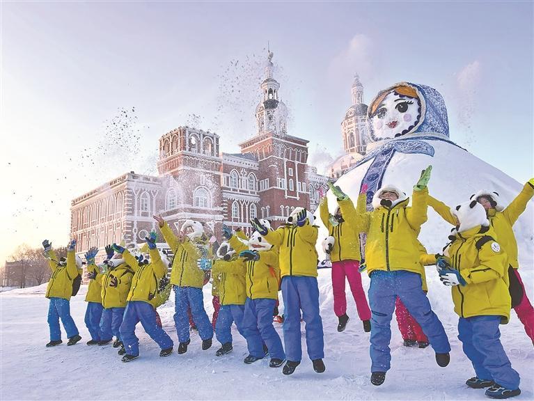 來(lái)自四川的研學(xué)團(tuán)隊(duì)在哈爾濱伏爾加莊園揚(yáng)雪嬉戲。