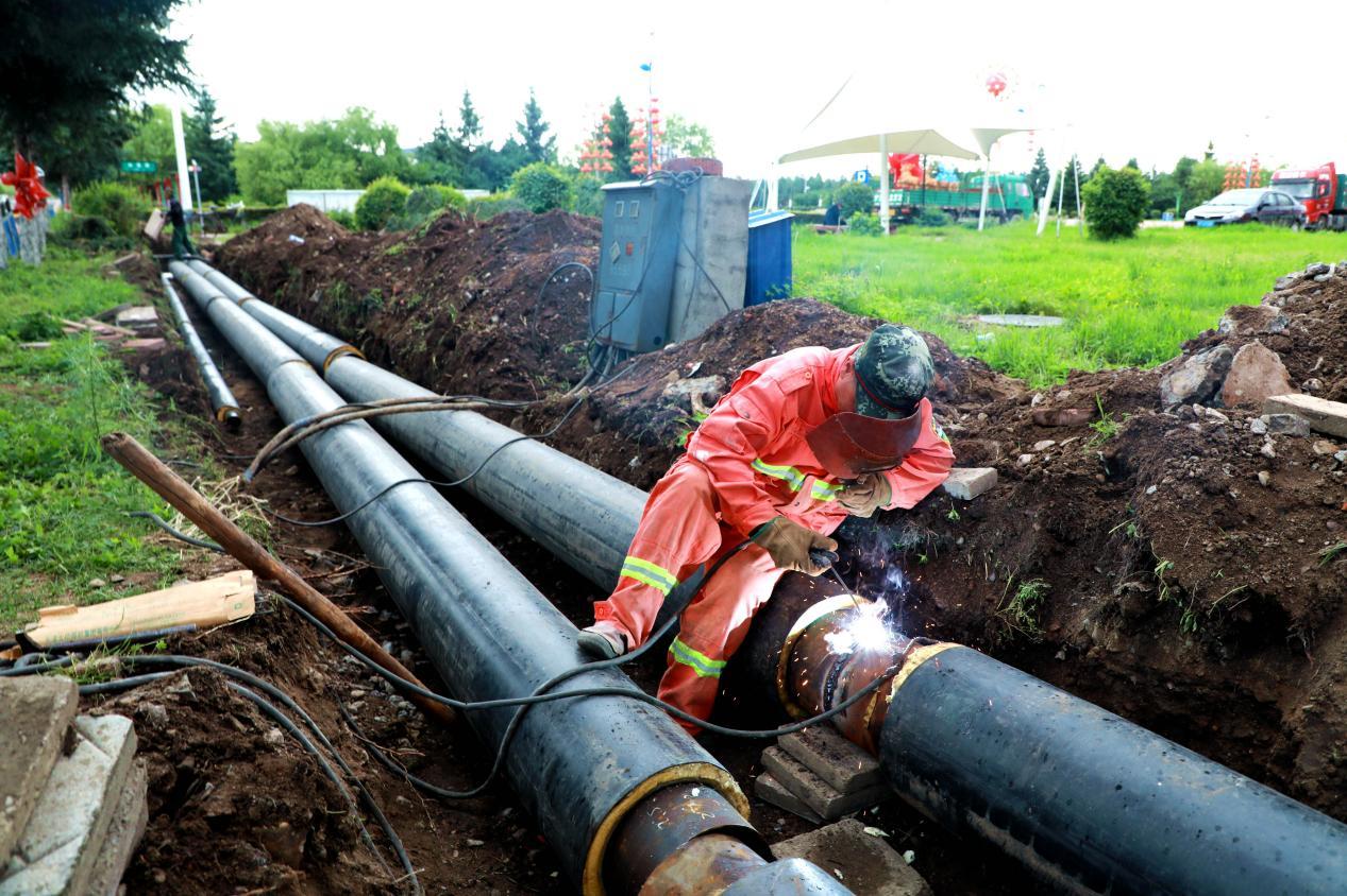 阿木爾林業(yè)局專(zhuān)業(yè)技術(shù)工人在鋪設(shè)供暖主管線,解決林海街平房用戶不熱問(wèn)題(王力 攝)