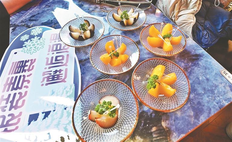 凍梨、凍柿子切塊、擺盤“搬上”列車。原勇攝