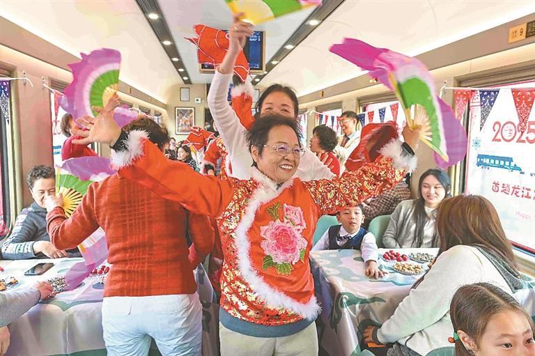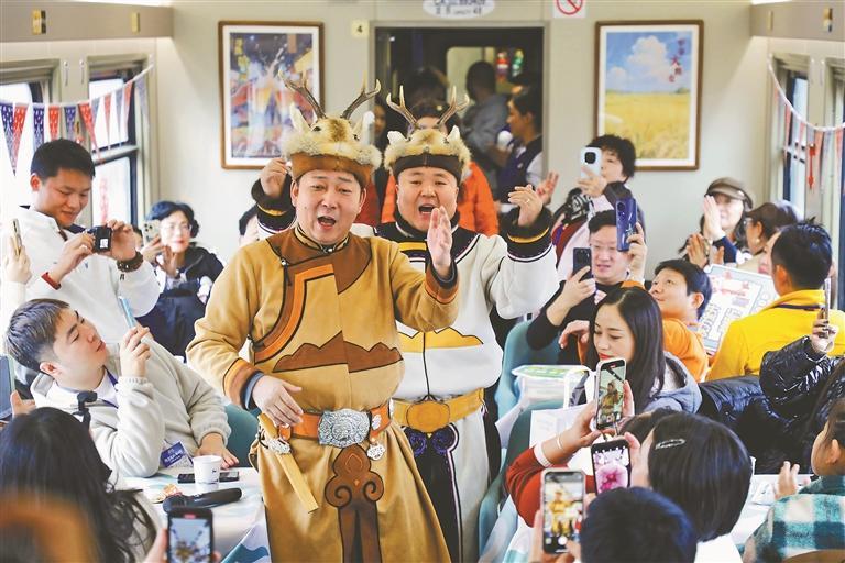 2月5日18時20分,K7041次“東北大花”主題列車從哈爾濱站緩緩駛出,一路向北,駛向漠河。車廂內(nèi),來自大興安嶺的鄂倫春族非遺代表性傳承人,現(xiàn)場展示用樺樹皮制作的手工藝品,列車工作人員身著民俗服飾帶領(lǐng)游客剪窗花,東北秧歌、二人轉(zhuǎn)表演更是點燃了旅途熱情。