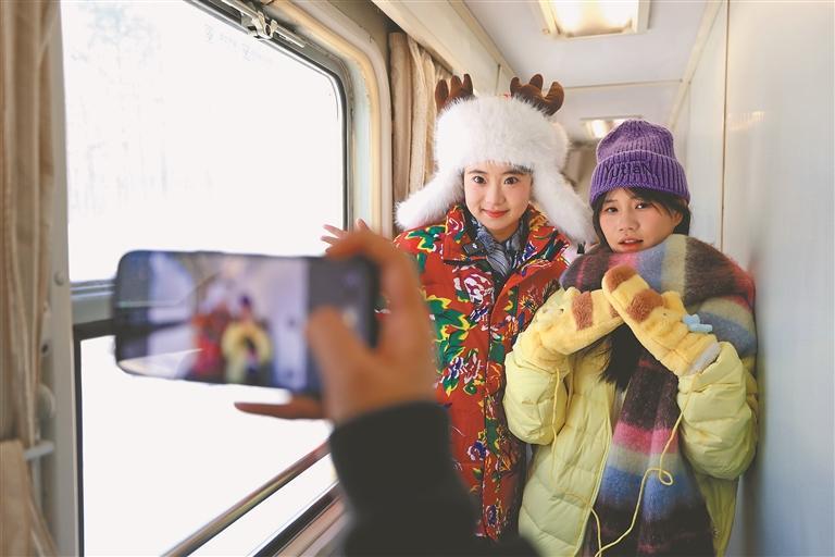 游客在哈爾濱開往亞布力方向的冰雪環(huán)線旅游列車旁合影留念。原勇攝